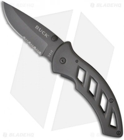 - Gray-finished, serrated drop point blade made from 420 steel.
